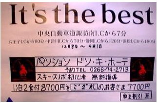 コマーシャル オーナー手作りの露天風呂 おいしい食事 野外シアター 本格的暖炉 ドライフラワーと観葉植物 −−−−−−−−−−−−−−−−−−−−−−− −−−−−−−−−−−−−−−−−−−−−−− 一言 スキー・スノボー 初心者 無料指導 大いに利用してください。 −−−−−−−−−−−−−−−−−−−−−−−− −−−−−−−−−−−−−−−−−−−−−−−− 詳しくは、電話・ファックスで!! |