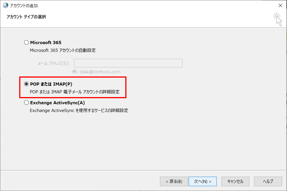 POPまたはIMAPを選択します。