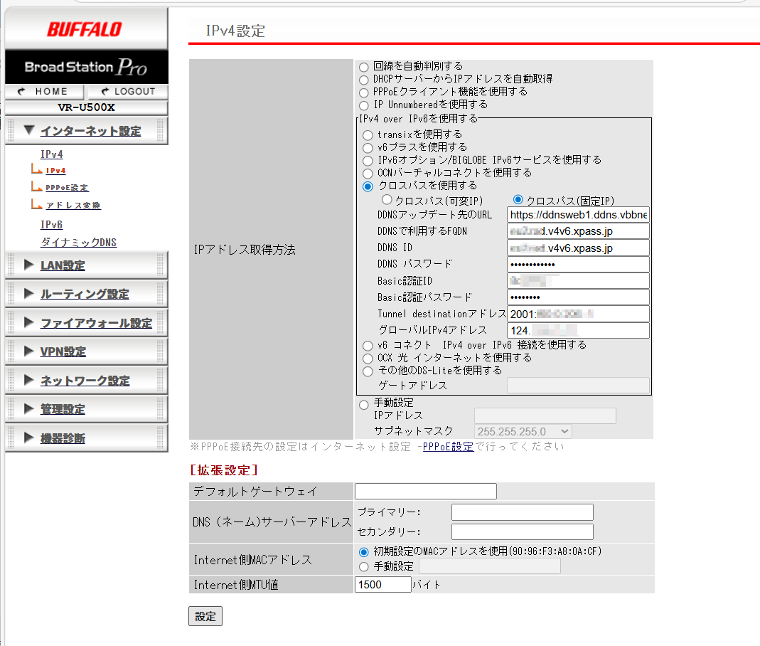 「クロスパスを使用する>クロスパス(固定IP)」を選び、弊社から開通時に通知された項目を入力します。