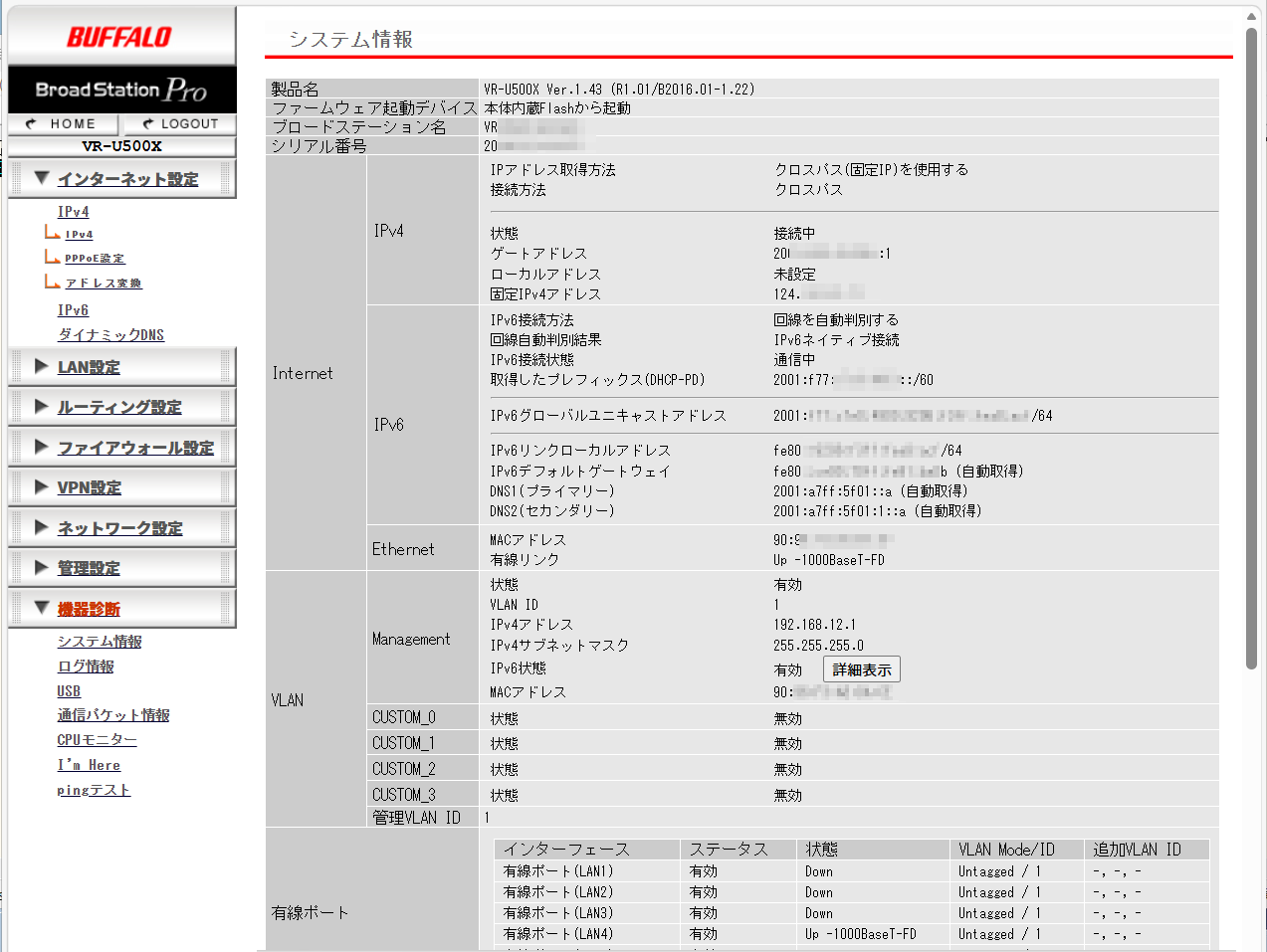 機能面では5つあるLANポートごとにVLANの設定がタグありなしもGUIでできるのは面白く、VPNもGUIでIPv4もIPv6でも組めるようになっています。同じ機種で本社と支店をつなげてそれぞれでUTMライセンスを投入する構成も導入しやすいのかなと思います。IP1だけかと思いきやIP8やIP16にも対応してきているのがバッファローらしいです。ほか導入に当たってはFortiGateなどのUTMのようにこの機種は透過ファイアウォールとして構成ができず、必ずルータとして設置しなければいけないといったことを押さえていけばよさそうです。