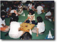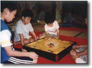 午前中ダブルスの部、午後からシングルの部が行われ、60㎝四方のカロム盤で熱い戦いが繰り広げられました。本年もクラス別に試合が行われ、シニアクラスの方もたくさん参加されていて、ベテランの腕前を披露されていました。また、幼児クラスではミニカロム盤(45㎝四方)を使って試合が行われ、ストライカーを弾く幼い眼差しは、大人顔負けでゲームを楽しんでいました。