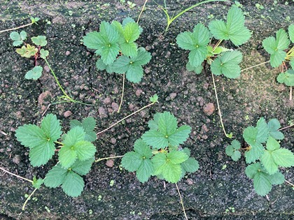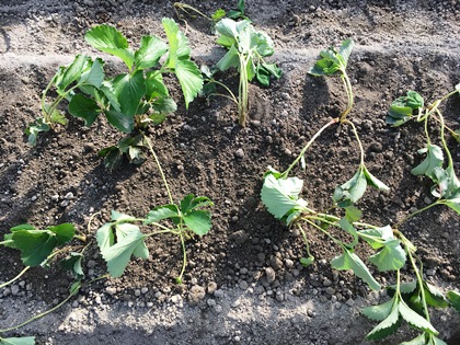 | 果実を溝側に成らすため親株側の ランナーを畝の中央向けに植え付け |