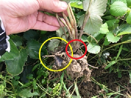 | 畝に植える方向があるので親株側の ランナー(黄)を目印に数センチ残す クラウン(赤・株元)は幅1cm以上のものを選ぶ |