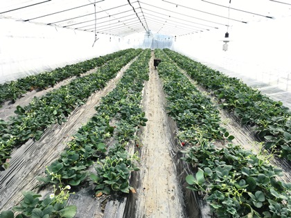 | 新設した大型ハウス(ここでイチゴを試作) | 視察で訪れた小杉豊農園のイチゴの土耕栽培 (30年度はこのようになる予定) |