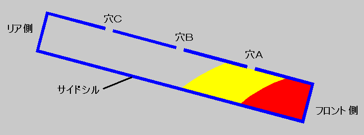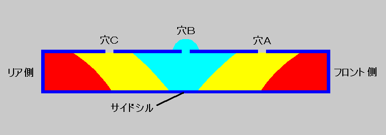 1) サイドシル周辺のプラスチックカバーや内張りを剥がす。作業性を考えるとシートも外した方が良いと思います。(私は外してません) 2) 注入口以外の穴やスポット溶接間の隙間はガムテープでしっかり塞ぐ。これを怠ると発泡の圧力でウレタンが噴き出し最悪の事態に・・・ 3) ガムテープなどで塞ぐ事の出来ないサイドシル後部端面や大きな穴は新聞紙を丸めて詰め込む。 4) サイドシル下部(車外)の合わせ目もガムテープで塞ぐ。(私の場合これをやっていなかったので、最初漏れました。) 5) ウレタンが付着しては困る場所を新聞紙とマスキングテープでマスキングする。 ここまでは根気さえあればできますが、注入は要領良くやらないと失敗しかねません。 6) まず、2液タイプなので反応時間を確認する。(A液とB液を少量1:1で混ぜ合わせ良くかき混ぜ発泡の始まるまでの時間を計測) 私の場合、気温32℃の時に作業したので発泡の始まる時間は約20〜25秒だった。つまり、この時間内に混合、攪拌、注入を終了しないと理想的な充填が得られない。(写真は発泡後) 7) 発泡倍率から片側のサイドシル部にどれくらいの量が必要か算出し、作業回数と手順を決める。 8) 端から充填させるためリアをジャッキアップして車体を傾ける。 9) フロントに側の穴Aから1回目の注入(1回の混合量各200cc 計400cc)を行い発泡が完了するのを待つ。(赤色の部分)