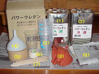 名称 用途 コメント (1) ウレタンA液 混ぜ合わせて反応させるタイプ キットに付属 (2) ウレタンB液 (3) レジャー用コップ 混ぜ合わせるための容器 説明書ではPETボトルの下半分を切って使用と書いてあったが、空のPETボトルが無かったので使い捨てのコップを購入(500ccくらいが良い) (4) ジョウゴ ボディへの注入に使用 付属の紙製ジョウゴでは先端が太く使えなかった (5) ガムテープ 穴、隙間を塞ぐ 布の織り込んだ強力なものが良い (6) マスキングテープ 汚れ防止 キットに付属 (7) 割り箸 かき混ぜ棒 (8) ゴム手袋 手への付着防止 キットに付属の手袋は私の手が入らなかった。(T T) (9) 新聞紙 汚れ防止、液漏れ防止