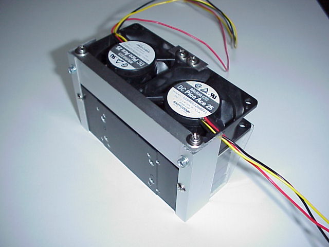 アルファのP12052SBを購入し、アルミのアングル材を加工して6cmファン×2を取り付け、ペルチェをシングルでセットしました。(下2枚の写真にはペルチェはついていません)