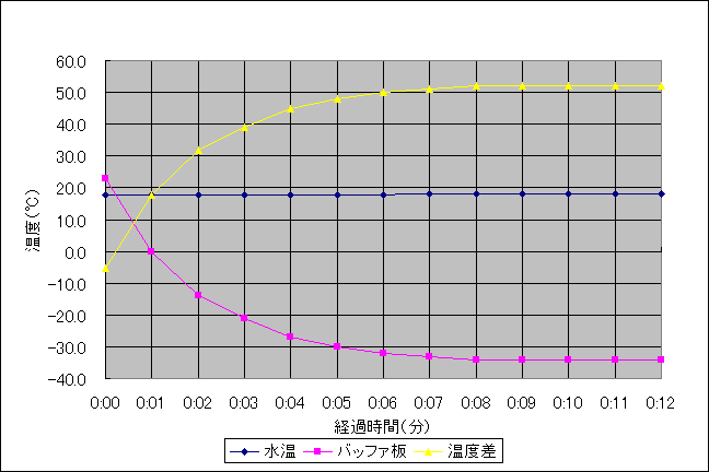 結果は水温とバッファ板との温度差約52℃を得ることができ、バッファ板の温度も−34℃を記録しました。さすがは水冷ですね。