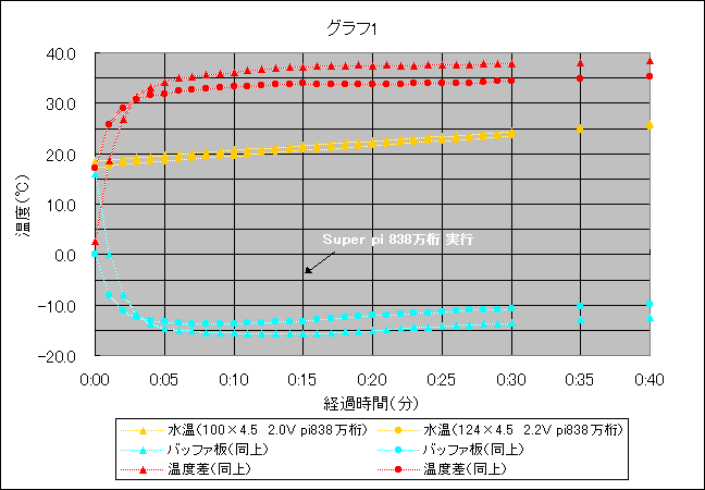 地下水循環により水温を一定に保ちバッファ板の温度を一定に保てるかテストしました。結果、Super piを実行してもバッファ板の温度上昇を+0.4℃におさえることができました。