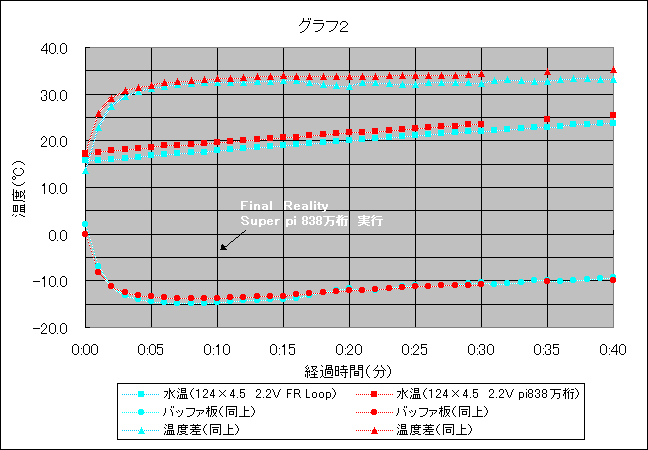 温度変化をまとめてみました。グラフ1はクロック450MHz・558MHzの温度比較、グラフ2はクロック558MHzでFRとSuper pi実行時の温度比較です。今回バッファ板の温度測定は側面で行いました。又、ベンチマークソフトは全て15分経過後よりスタートしています。