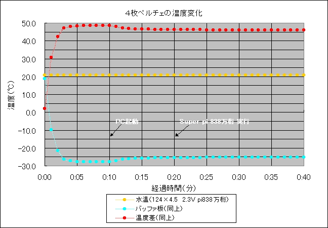 ペルチェを2枚から4枚に変更しテストを実施しました。また、結露対策についても、それなりに盛り込んだので同時に確認することにします。今回はCeleronの耐性が落ちてきたことから、コア電圧を2.3Vに上げてバッファ板の温度が安定してからPCを起動しました。